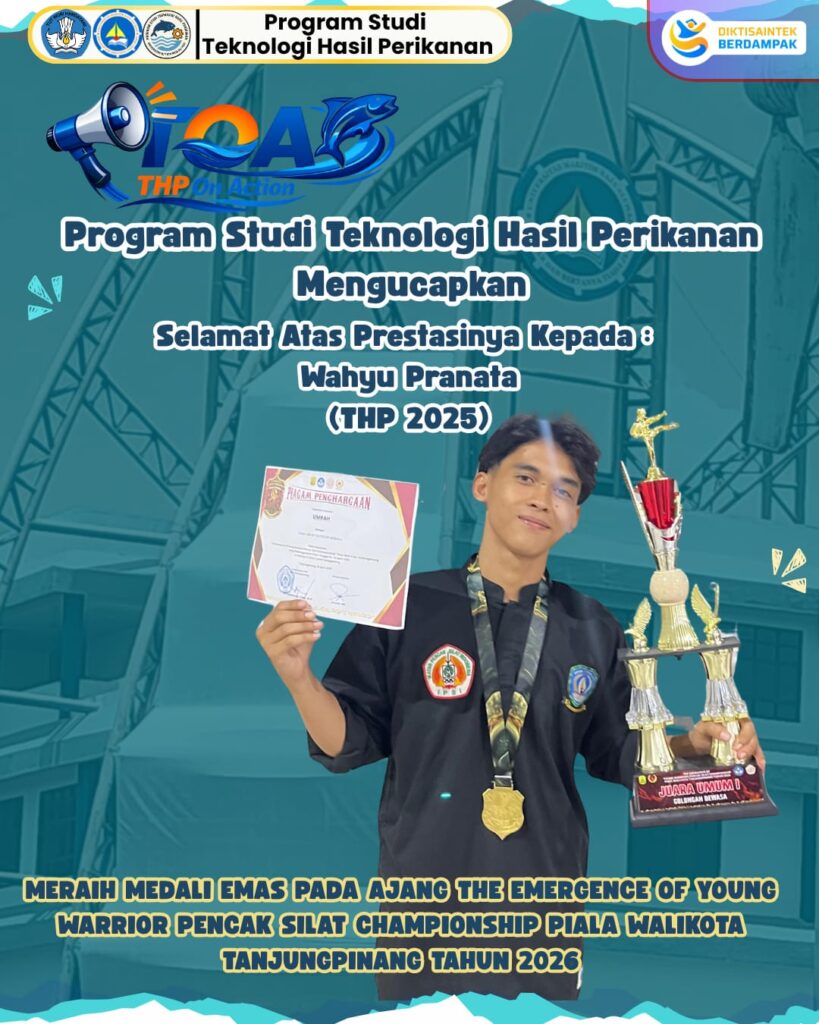Mahasiswa Program Studi Teknologi Hasil Perikanan (THP) kembali menorehkan prestasi membanggakan. Wahyu Pranata (THP 2025) berhasil meraih medali emas dalam ajang The Emergence of Young Warrior Pencak Silat Championship Piala Wali Kota Tanjungpinang Tahun 2026 yang diselenggarakan pada 10–12 April 2026 di Gedung Serbaguna 5 Lantai Senggarang, Kota Tanjungpinang. Kejuaraan ini menjadi ajang bergengsi yang mempertemukan atlet-atlet pencak silat berbakat dari berbagai daerah. Dalam kompetisi tersebut, Wahyu tampil gemilang hingga berhasil meraih Juara Umum I pada kategori golongan dewasa. Prestasi ini menjadi bukti nyata dari kerja keras, disiplin, serta dedikasi tinggi yang telah ia bangun selama proses latihan.